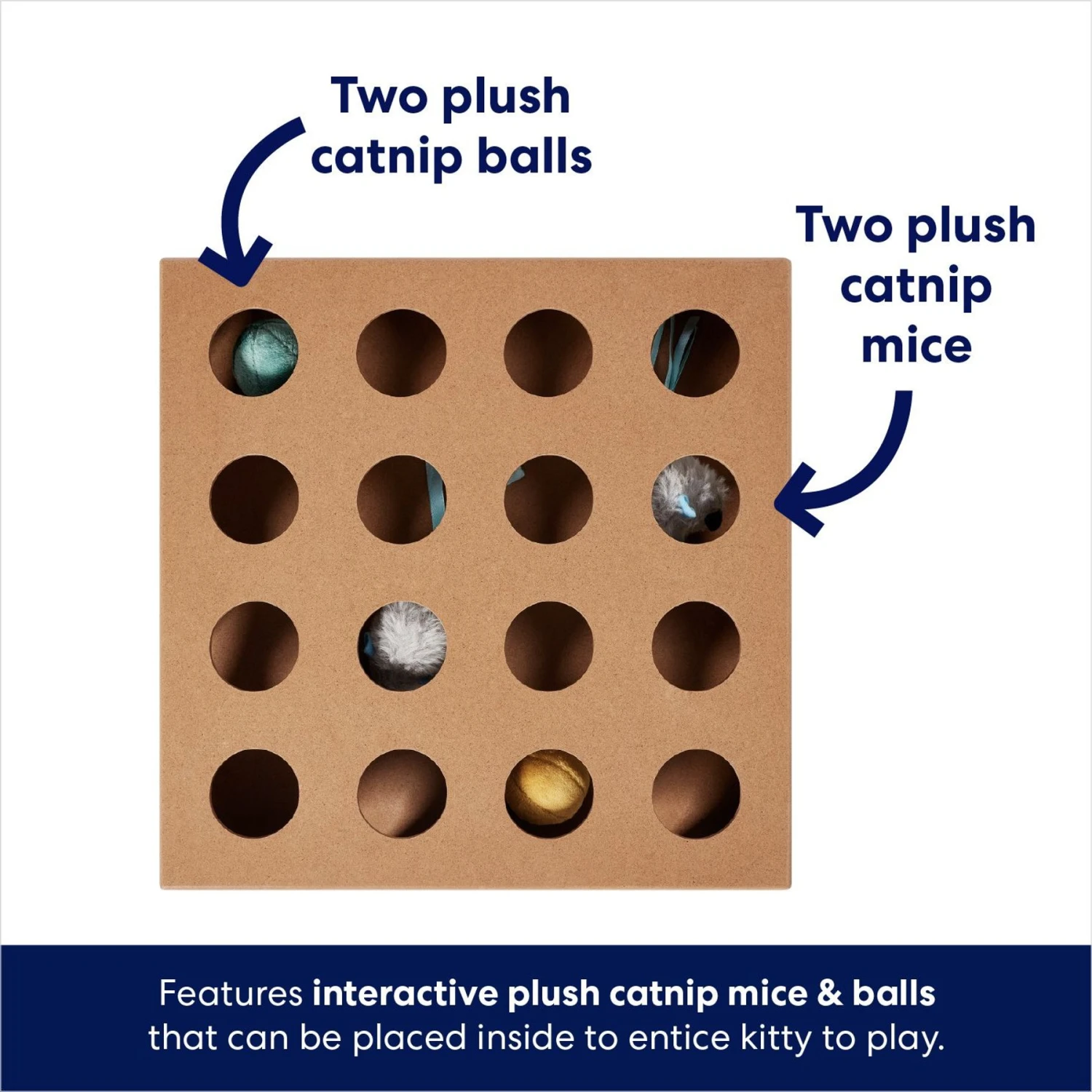- From Frisco by Chewy. This sturdy wooden box features some exciting surprises inside—two plush mice and two furry ball toys (both stuffed with catnip!) to entice your kitty’s claws and attention.